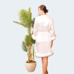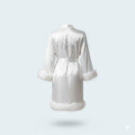 احتفلي بيومك المميز بأقصى درجات الراحة والأناقة مع هذا الروب الفاخر من الساتان الحريري الأبيض، المزود بتفاصيل ريش ناعمة على الأكمام والحافة تضيف لمسة من السحر والفخامة. مصنوع من قماش ساتان ناعم وفاخر يمنحك إحساساً حريرياً لطيفاً على البشرة، ويتميز الروب بقصة مريحة وفضفاضة. يحدد حزام الخصر القابل للتعديل قوامك برشاقة، بينما يضفي النقش المتلألئ الدقيق في الظهر لمسة عروسية راقية. مثالي للتحضيرات قبل الزفاف، صباحات شهر العسل، أو كقطعة خالدة من الذكريات، يجمع هذا الروب بين الأناقة والفخامة والتصميم المدروس للعرائس اللواتي يستحقن الأفضل.