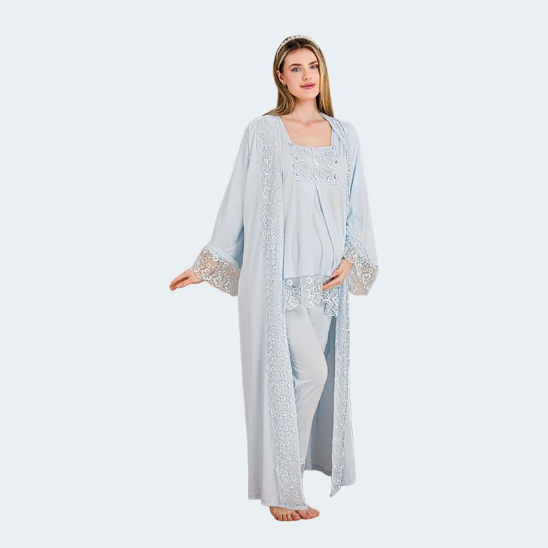 اختبري مزيجًا مثاليًا من الراحة والأناقة والأنوثة مع طقم بيجاما الحمل المكوّن من ثلاث قطع، المصنوع بحرفية عالية في تركيا. مصنوع من قماش ناعم وقابل للتنفس والتمدد، يتكيف بسهولة مع تغيرات جسمك طوال فترة الحمل وما بعدها. تتميز البلوزة ذات الأكمام الطويلة، والبنطال، والروب المتناسق بتفاصيل دانتيل ناعمة تضيف لمسة من الأناقة والرقي إلى ملابس المنزل. صمم الطقم ليوفر أقصى درجات الراحة، حيث توفر القصة المريحة والخامات القابلة للتنفس الدعم الذي تحتاجينه يوميًا، سواء كنتِ تستريحين، ترضعين، أو تستمتعين بلحظات هادئة في المنزل. احتضني الأمومة بأناقة مع هذا الطقم الفاخر والعملي.