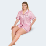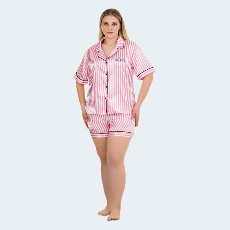 طقم بيجاما فاخر للمقاسات الكبيرة من الساتان الحريري المخطط – قطعتان (شورت وقميص بنصف كم)
