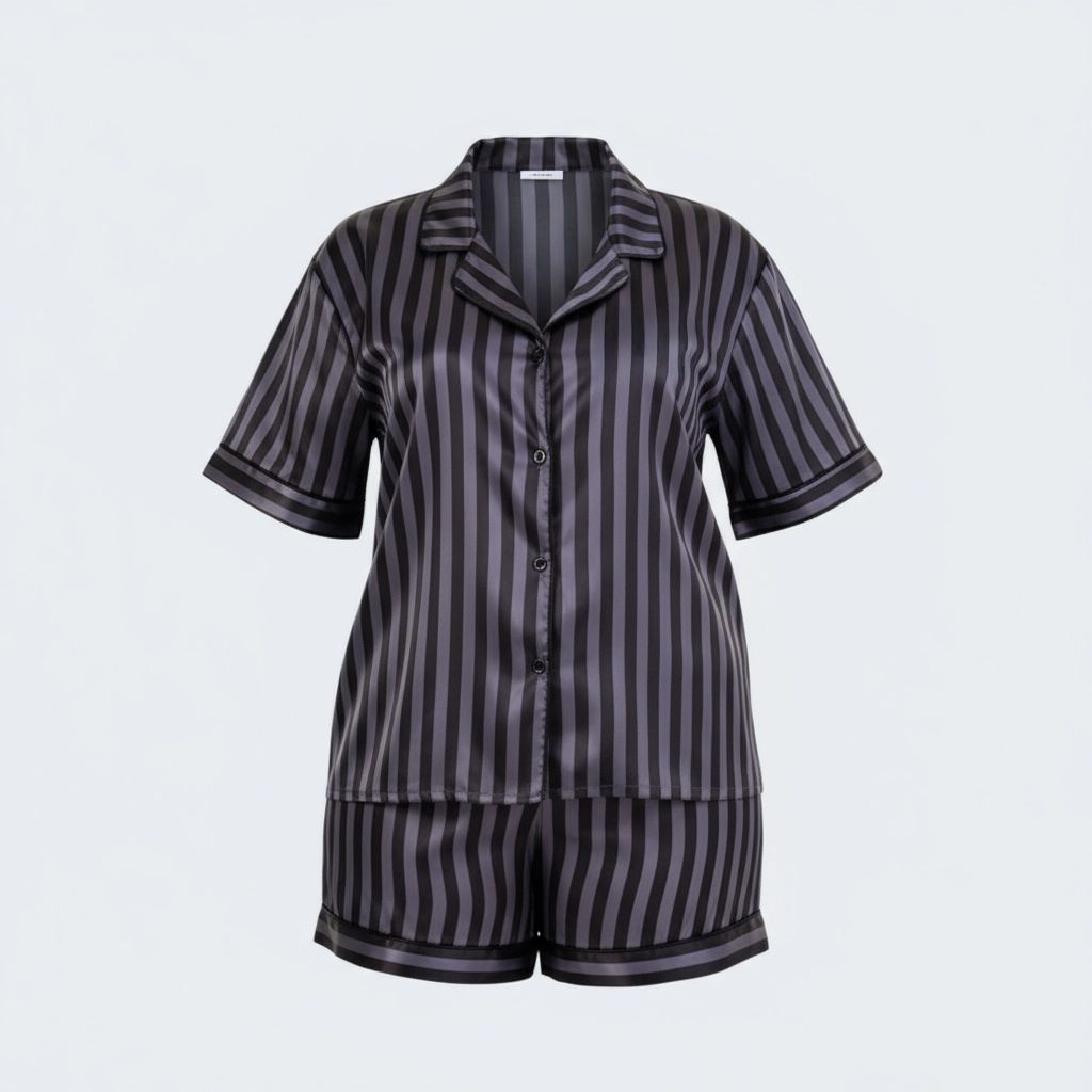 طقم بيجاما فاخر للمقاسات الكبيرة من الساتان الحريري المخطط – قطعتان (شورت وقميص بنصف كم)