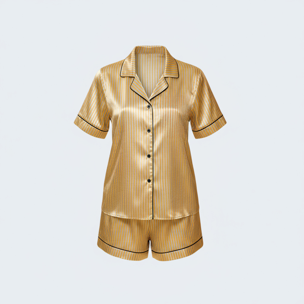 طقم بيجاما فاخر من الساتان الحريري المخطط – قطعتان (شورت وقميص بنصف كم)