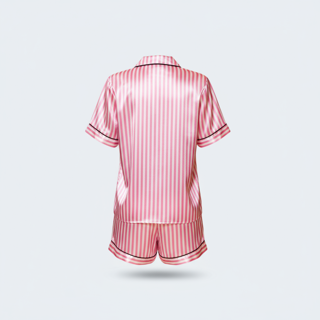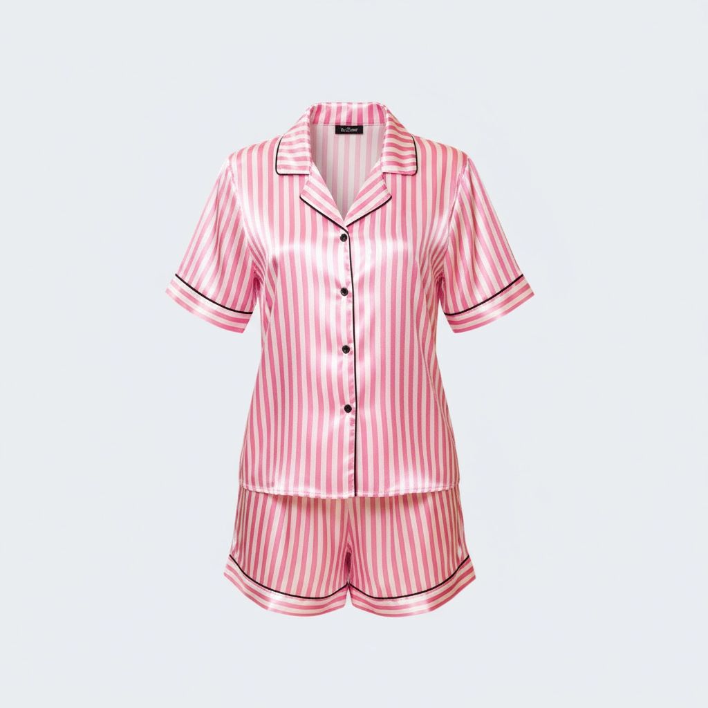 طقم بيجاما فاخر من الساتان الحريري المخطط – قطعتان (شورت وقميص بنصف كم)