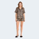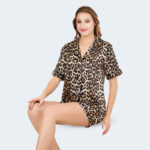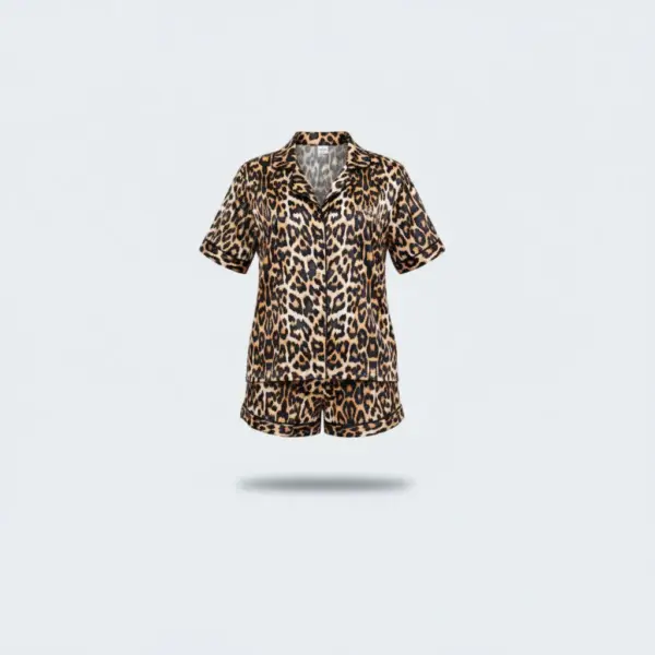 طقم بيجاما فاخر من الساتان الحريري بنقشة النمر – قطعتان (شورت وقميص بنصف كم)