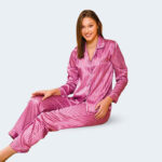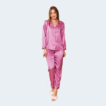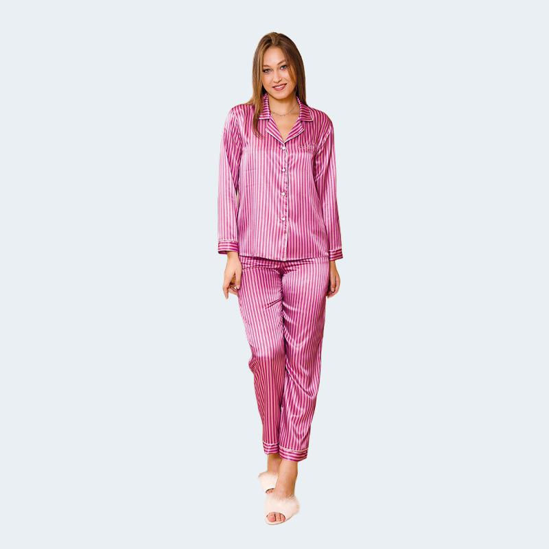 طقم بيجاما فاخر من الساتان اللامع المخطط – قطعتان | بنطال وقميص بأكمام طويلة