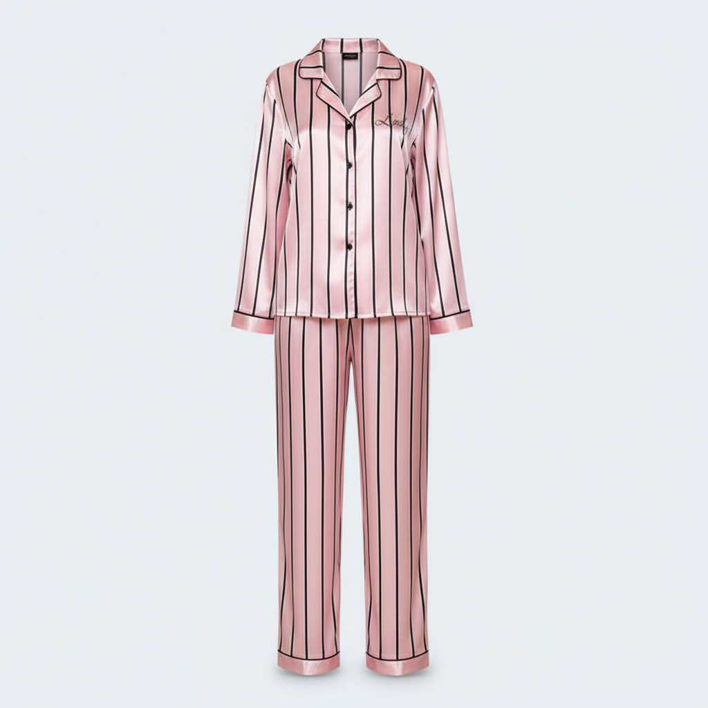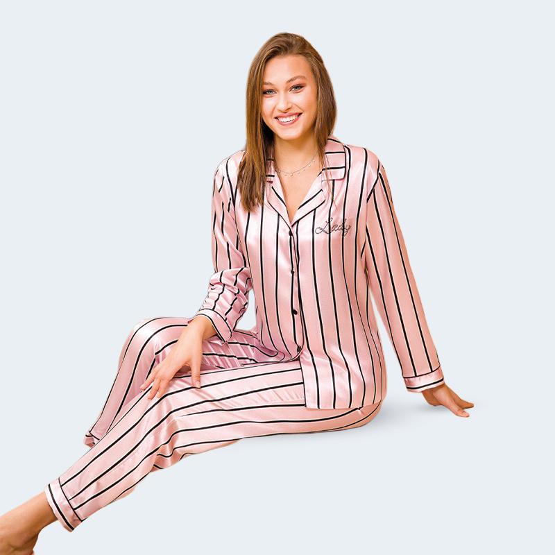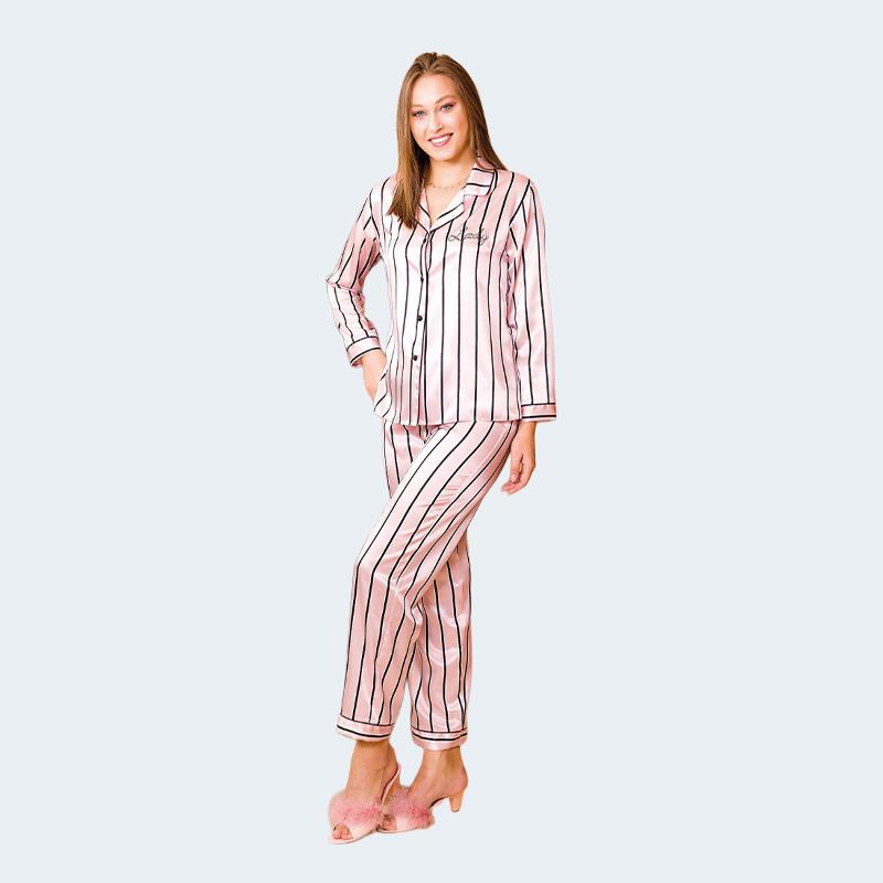 استمتعي بالأناقة والراحة مع طقم البيجاما الفاخر المكون من قطعتين من الساتان المخطط. يتميز بقميص بأكمام طويلة وأزرار أمامية أنيقة، وبنطال طويل بخصر مطاطي يمنحك راحة مثالية، مما يجعله الخيار الأمثل للنوم أو الاسترخاء في المنزل. صُنع في تركيا من قماش ساتان ناعم وحريري ليمنحك مظهراً أنثوياً راقياً وشعوراً خفيفاً ومريحاً لأقصى درجات الاسترخاء.