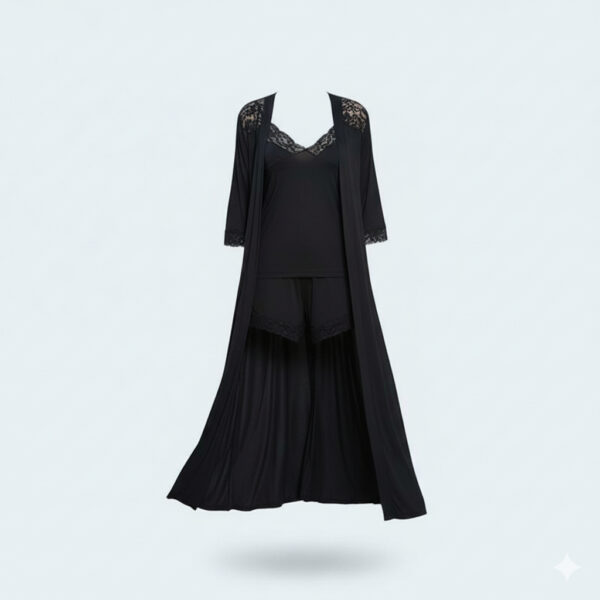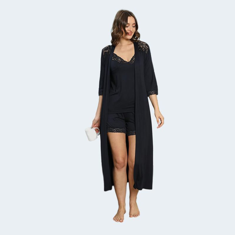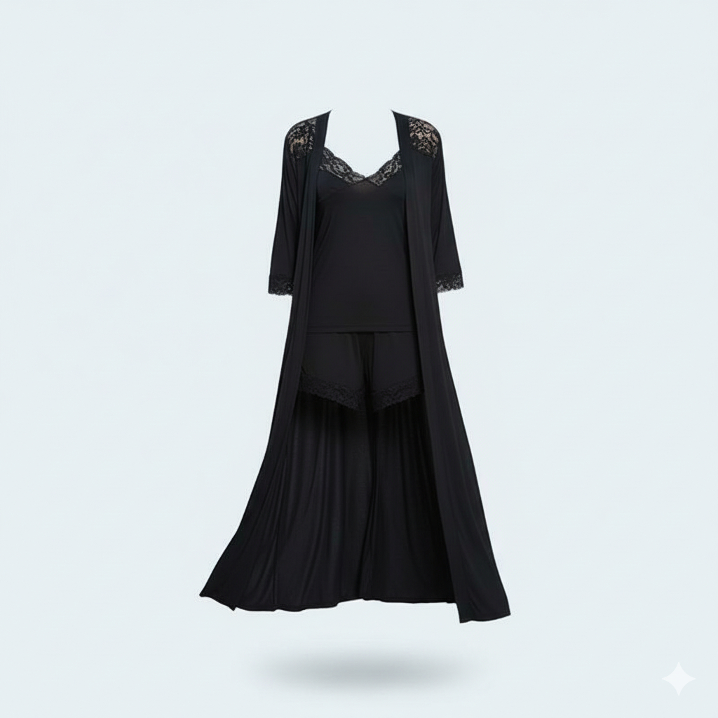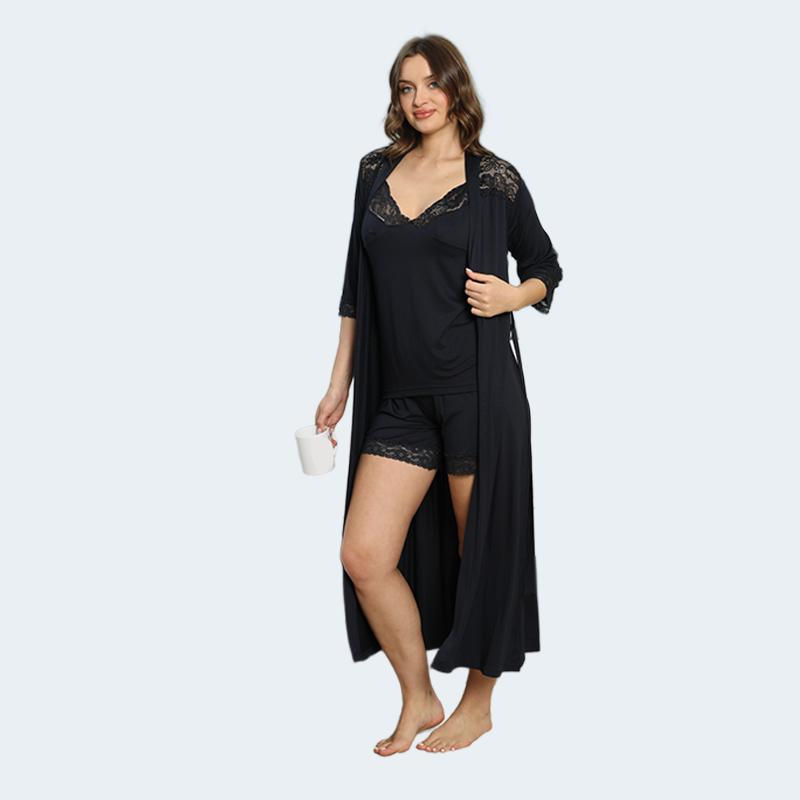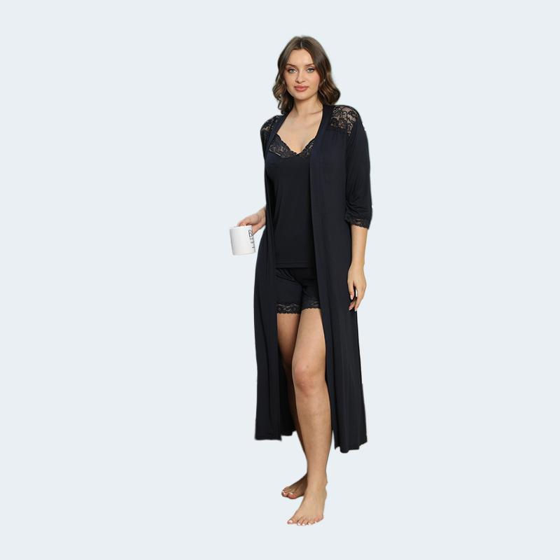 طقم بيجاما فيسكوز مكون من ثلاث قطع بتفاصيل دانتيل رقيقة من شورت، بلوزة بحمالات رفيعة، وروب متناسق