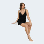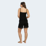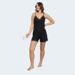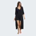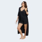 – طقم مكون من ثلاث قطع يشمل شورت مريح، بلوزة بحمالات رفيعة، وروب متناسق