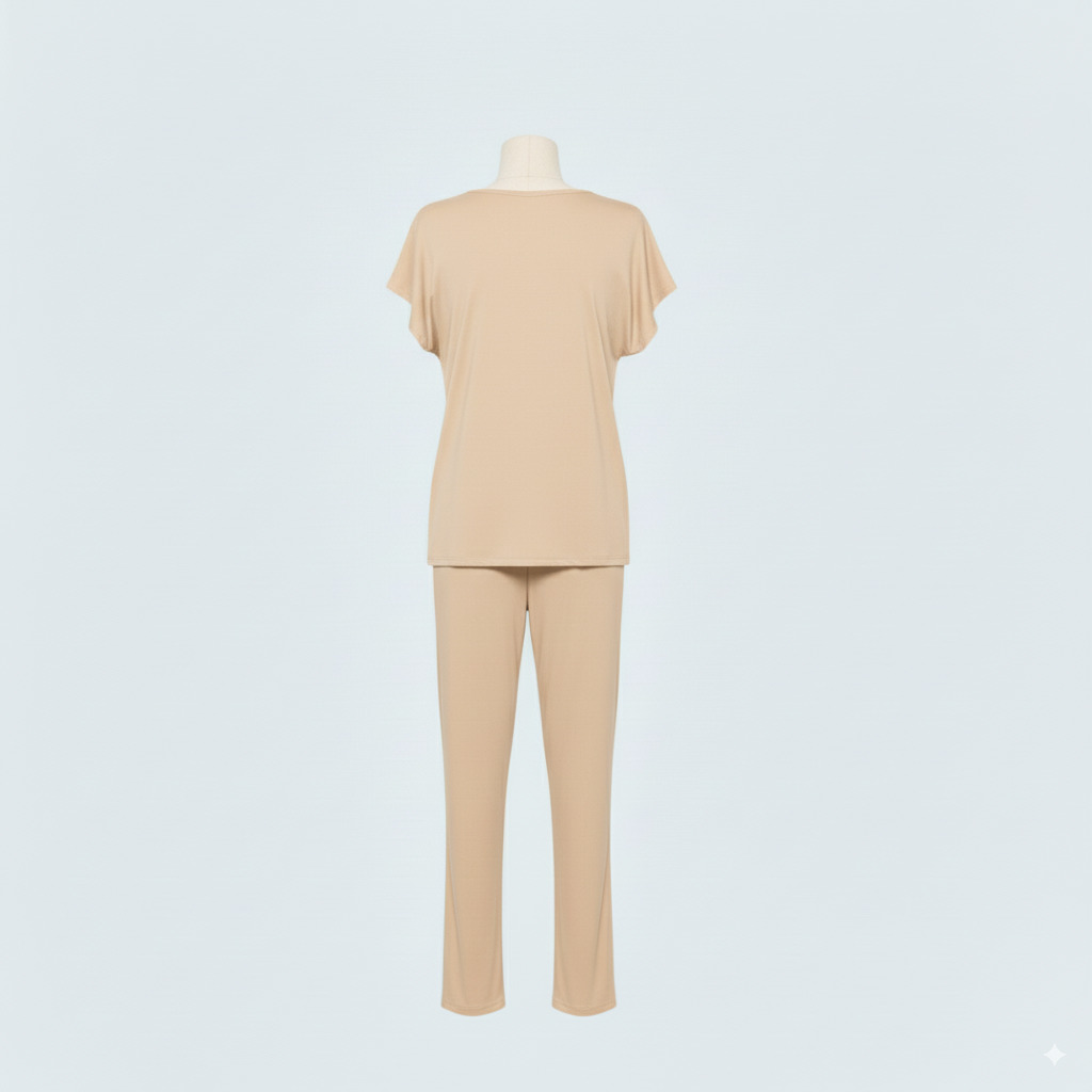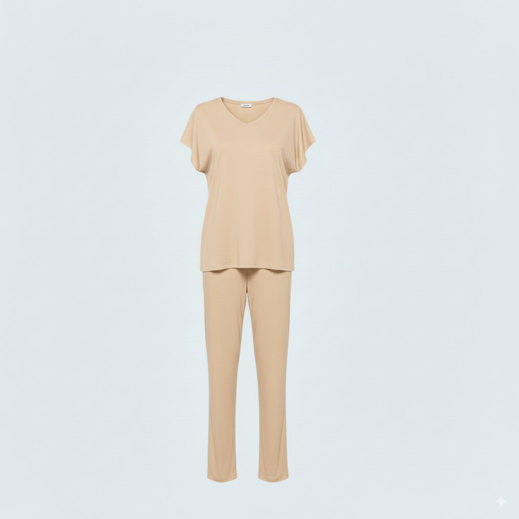 استمتعي بالأناقة المريحة مع طقم بيجاما فيسكوز مكون من بنطال واسع وبلوزة ناعمة بأكمام قصيرة. مصنوع في تركيا من مزيج فاخر بنسبة 95٪ فيسكوز و5٪ ليكرا، يتميز القماش بخفة وزنه ونعومته وتهويته الفائقة. تمنحكِ القصة المريحة إحساسًا فائقًا بالراحة طوال الليل، مما يجعله مثاليًا للاسترخاء في المنزل والنوم الهادئ والمريح بأناقة.