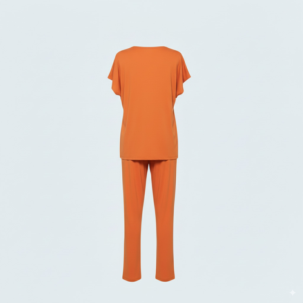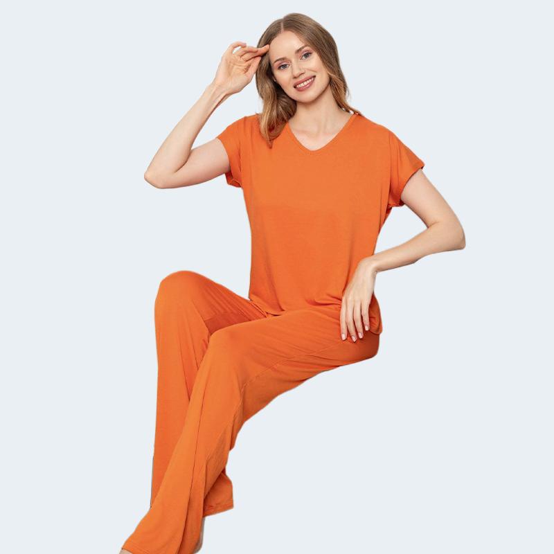 استمتعي بالأناقة المريحة مع طقم بيجاما فيسكوز مكون من بنطال واسع وبلوزة ناعمة بأكمام قصيرة. مصنوع في تركيا من مزيج فاخر بنسبة 95٪ فيسكوز و5٪ ليكرا، يتميز القماش بخفة وزنه ونعومته وتهويته الفائقة. تمنحكِ القصة المريحة إحساسًا فائقًا بالراحة طوال الليل، مما يجعله مثاليًا للاسترخاء في المنزل والنوم الهادئ والمريح بأناقة.