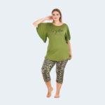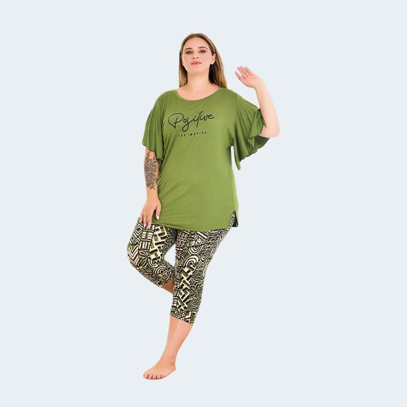 يتميز طقم بيجاما كابري للمقاسات الكبيرة هذا بصناعة تركية متقنة باستخدام مواد عالية الجودة لضمان الراحة والمتانة. يتكون الطقم من قطعتين مع أكمام قصيرة واسعة بتصميم فريد يوفر راحة إضافية ومظهراً أنيقاً مميزاً. مصنوع من قماش ناعم وقابل للتنفس، مما يجعله مثالياً للبقاء باردًا ومريحًا في الأيام الحارة أثناء الاسترخاء في المنزل. متوفر بمجموعة واسعة من المقاسات الكبيرة، مصمم ليمنحك تناسباً جميلاً يناسب جميع أشكال الجسم.