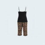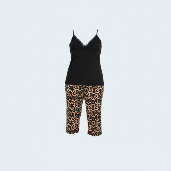طقم بيجاما للمقاسات الكبيرة من بنطال كابري بنقشة النمر مع قميص أسود بتفاصيل دانتيل ناعمة