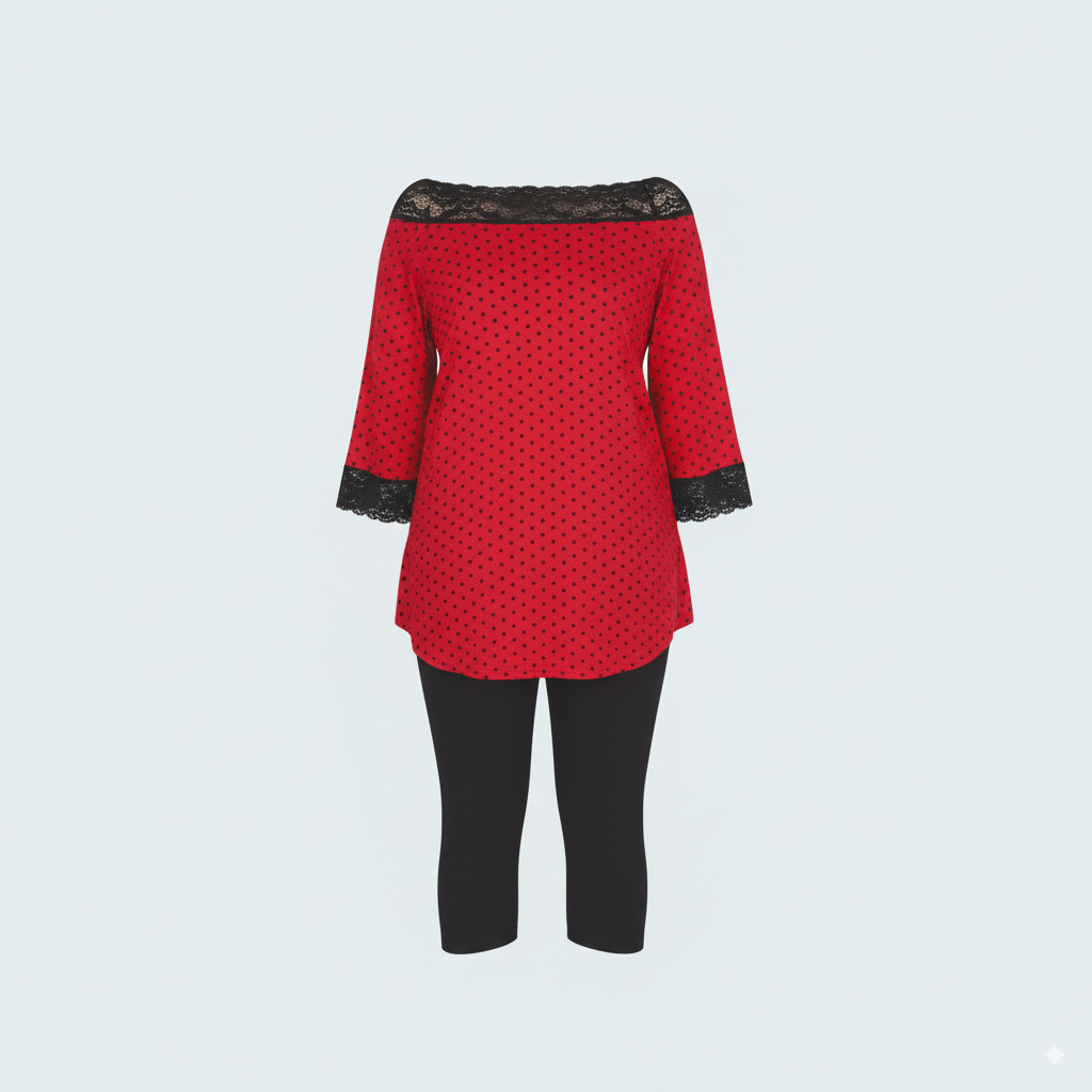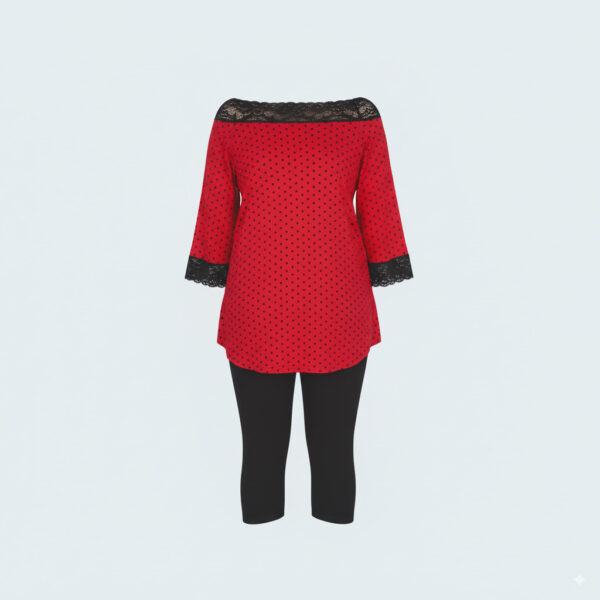 طقم بيجاما للمقاسات الكبيرة من بنطال ليقنز كابري مع بلوزة طويلة مزينة بالدانتيل الناعم