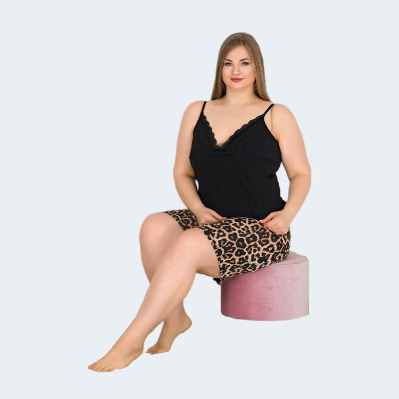 ارتقي بأناقتك في المنزل مع طقم البيجاما العصري هذا للمقاسات الكبيرة، والذي يضم شورت بنقشة نمر وقميص أسود مزين بدانتيل ناعم. مصنوع بعناية في تركيا من قماش خفيف وقابل للتهوية لتوفير أقصى درجات الراحة والأناقة، خاصة في الأيام الحارة. مصمم ليناسب القوام الممتلئ ومتوفر بمجموعة واسعة من المقاسات.