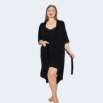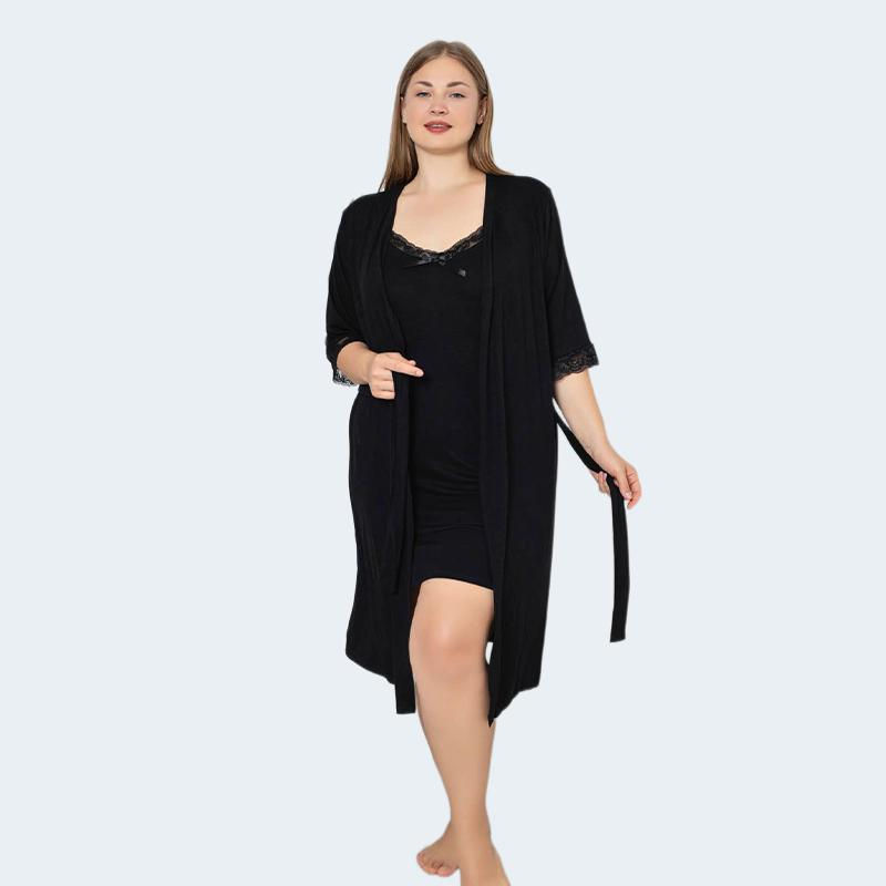 طقم قميص نوم قصير فيسكوز للمقاسات الكبيرة مع روب بتفاصيل دانتيل ناعمة
