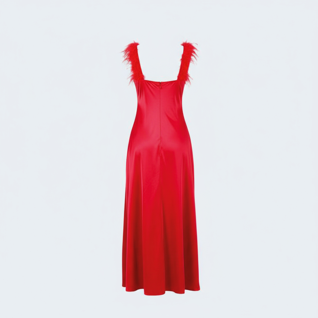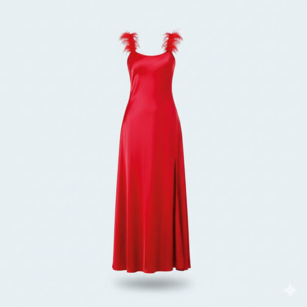 – قميص النوم مزود بفتحة جانبية أنيقة وحمالات ريشية تضيف لمسة ناعمة وفاخرة