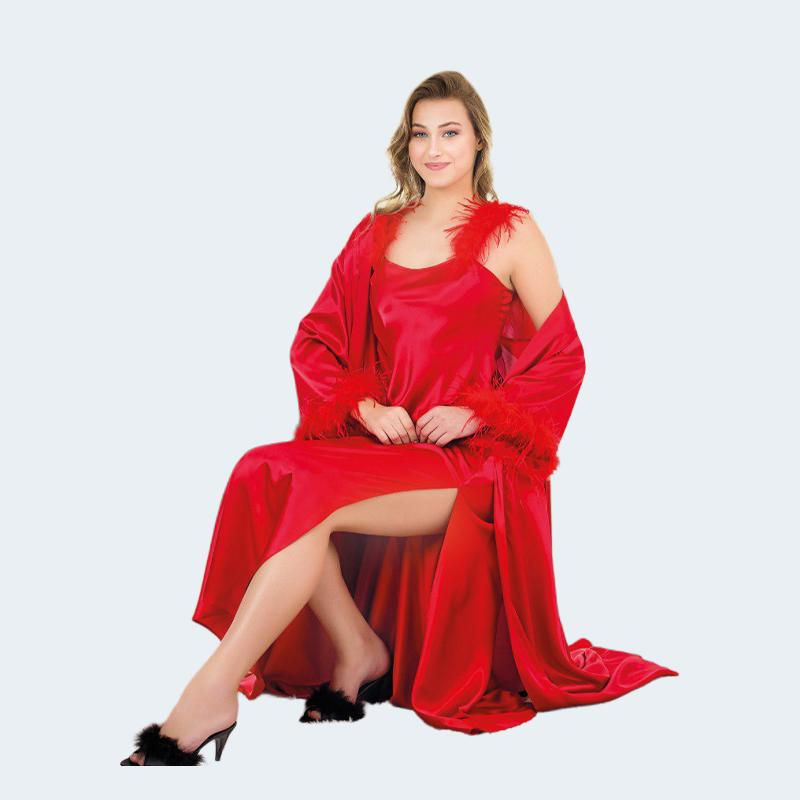 طقم قميص نوم ماكسي بفتحة جانبية وحمالات ريشية مع روب ساتان فاخر بأكمام ريشية