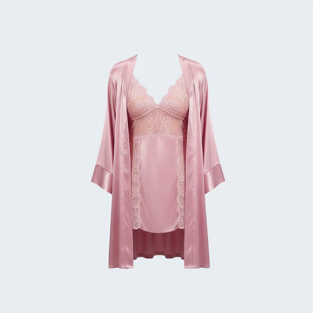 – طقم لانجري فاخر مكون من قطعتين: قميص نوم بدانتيل ناعم وروب ساتان حريري