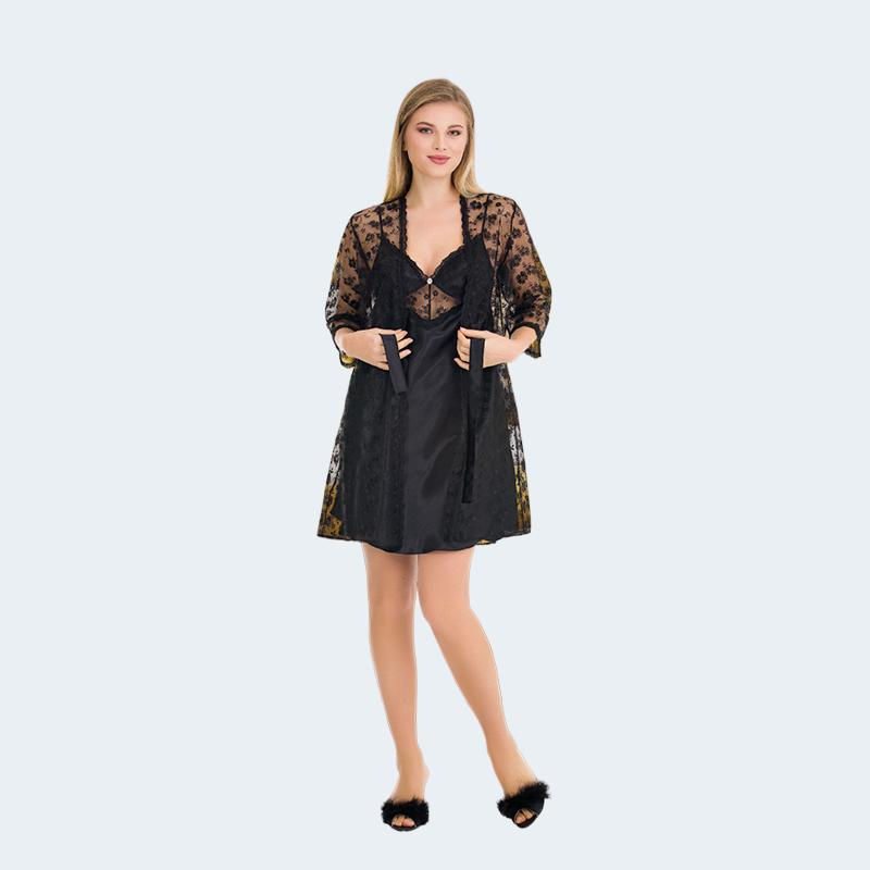 – يتميز بقميص نوم ساتان مزين بتفاصيل دانتيل دقيقة، مع روب دانتيل كامل لمنظر أنيق ومنسجم