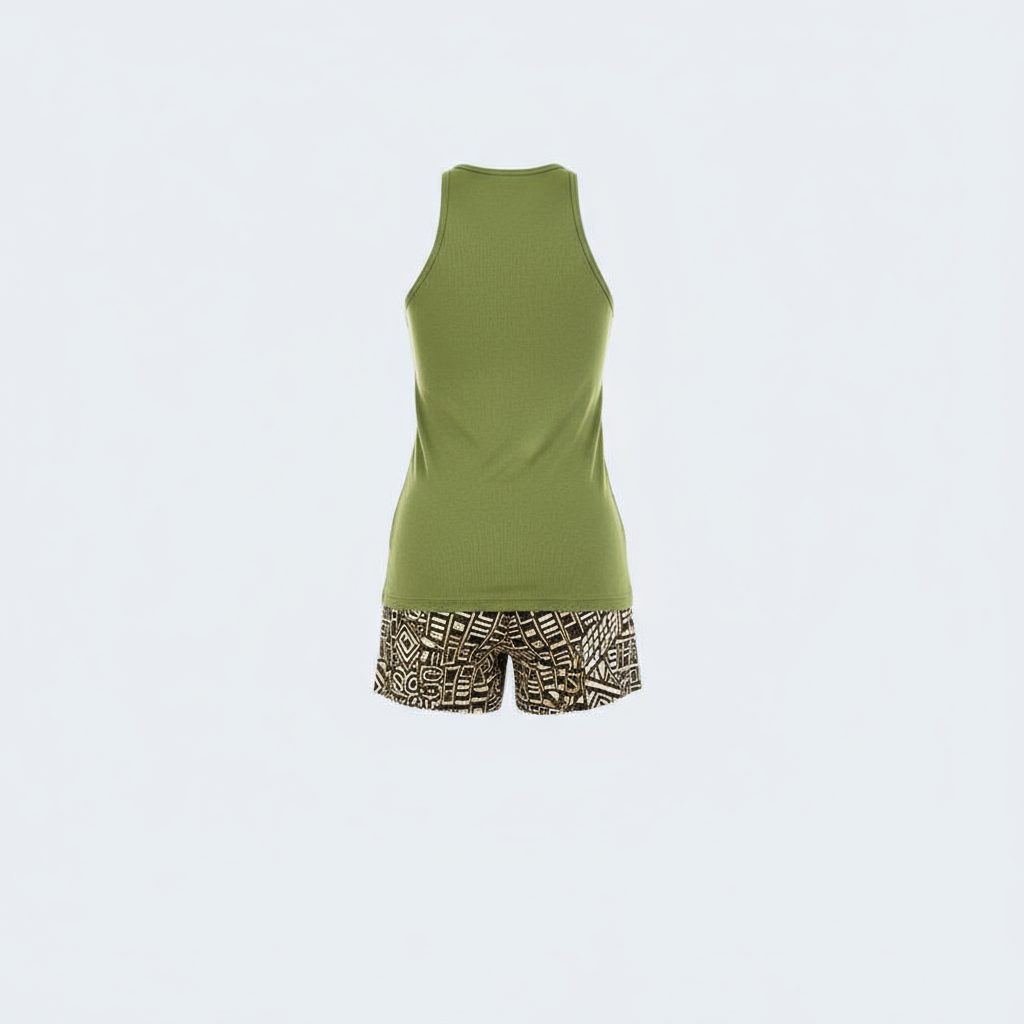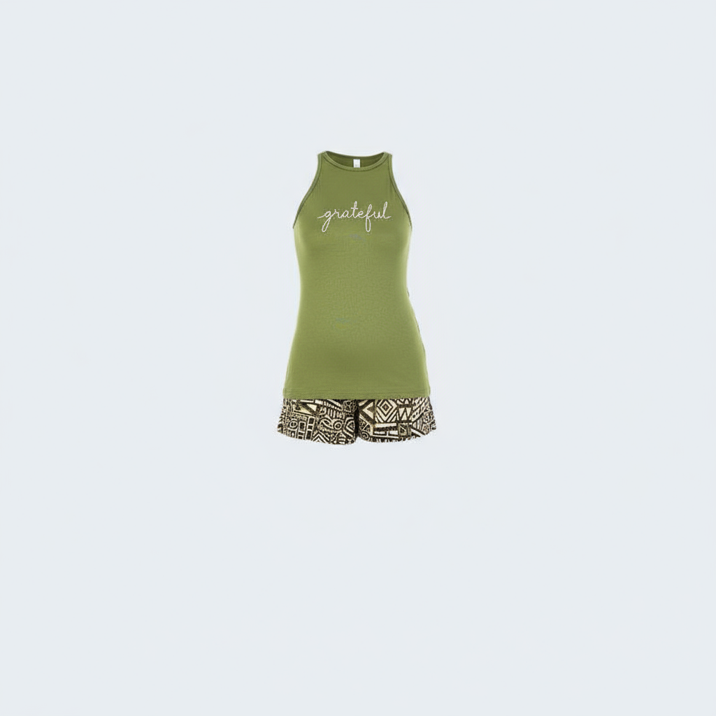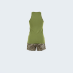 – طقم بيجاما مكون من قطعتين: توب ضيق وشورت مريح
