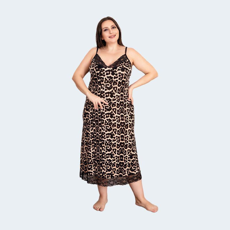 استمتعي بالأناقة والراحة بسهولة مع هذا الفستان المنزلي للمقاسات الكبيرة، المزخرف بنقشة النمر الجريئة وتفاصيل دانتيل ناعمة ورقيقة. مصنوع من قماش خفيف وقابل للتهوية، ويوفر حرية حركة وملاءمة جذابة للاسترخاء أو النوم. صناعة تركية متقنة، يضفي هذا الفستان لمسة من الأناقة على أوقات راحتك اليومية، وهو مثالي للجمع بين الموضة والراحة في خزانة ملابس المنزل.