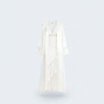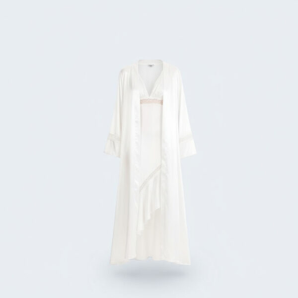 – طقم من قطعتين: قميص نوم ساتان حريري بتصميم مائل مع روب متناسق