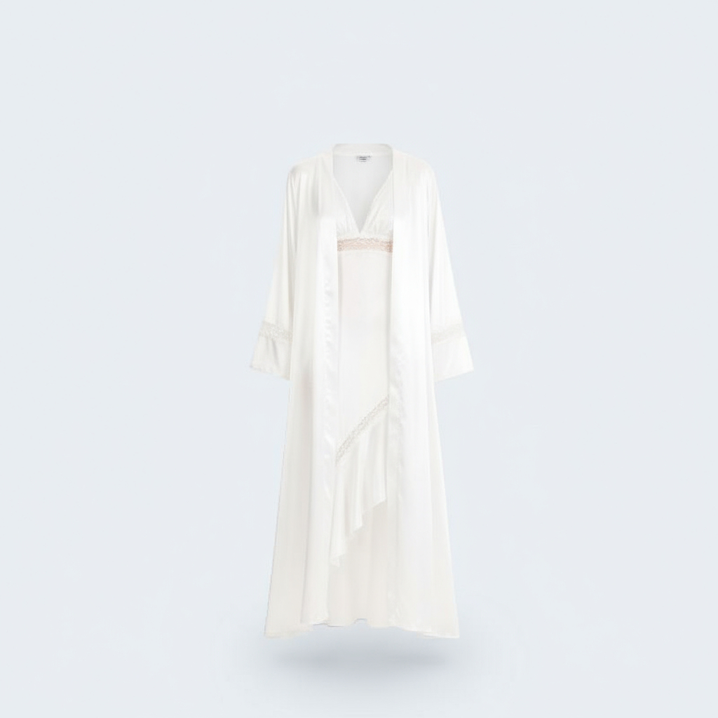 قميص نوم ساتان حريري بتصميم مائل مع روب ولمسات دانتيل ناعمة
