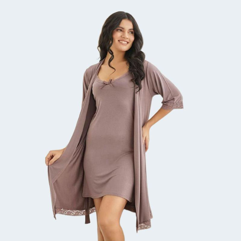 طقم قميص نوم قصير فيسكوز للمقاسات الكبيرة مع روب بتفاصيل دانتيل ناعمة