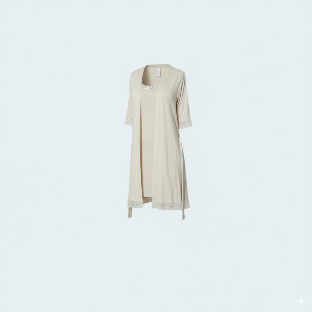 قميص نوم قصير فيسكوز بفتحة جانبية مع روب بتفاصيل دانتيل ناعمة